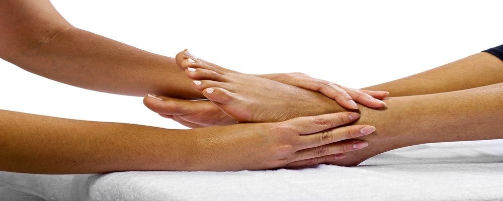 Doctor’s hands examining a patient’s foot.